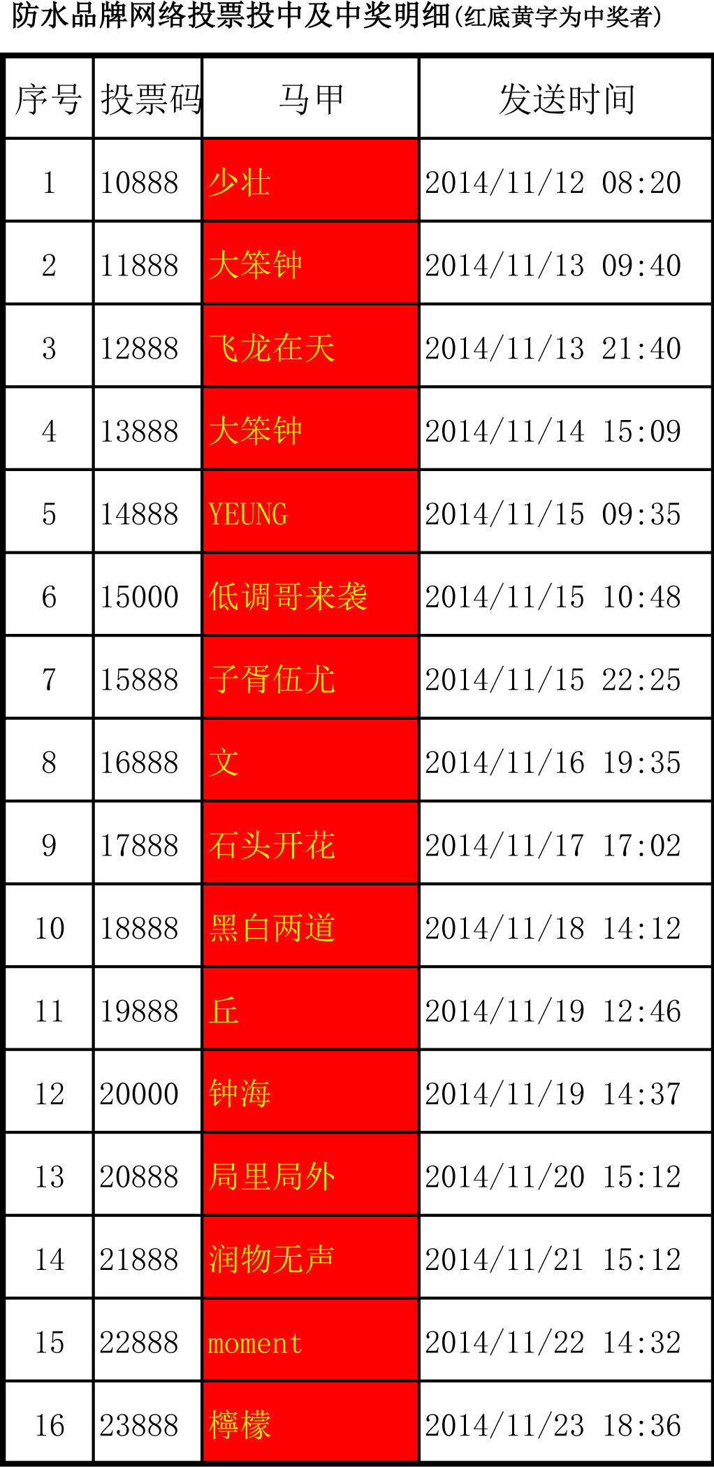 前16項(xiàng)投中及中獎(jiǎng)名單公布如下:少壯、大笨鐘、飛龍?jiān)谔?、大笨鐘、YEUNG、低調(diào)哥來(lái)襲、子胥伍尤、文、石頭開(kāi)花、黑白兩道、丘、鐘海、局里局外、潤(rùn)物無(wú)聲、moment、檸檬。恭喜他們,也請(qǐng)大家繼續(xù)支持青龍,只為青龍投票!