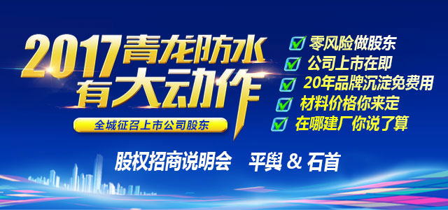 2017年2月5日和2月8日,青龍建材股份將分別在河南平輿和湖北石首召開(kāi)以"零風(fēng)險(xiǎn)做股東"為主題的股權(quán)招商會(huì),這是一場(chǎng)以防水材料工廠經(jīng)營(yíng)、盈利模式發(fā)展趨勢(shì)研討和青龍建材股權(quán)招商為一體的項(xiàng)目招商說(shuō)明會(huì),屆時(shí)還將舉辦與防水相關(guān)的大型活動(dòng)。