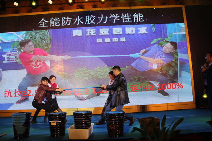 ▲新品發(fā)布會上,青龍防水薛興勇博士發(fā)布了青龍公司全能防水膠、粘彈防水密封膠、家居防水專用卷材、砼1號、砼2號五款新產(chǎn)品,并現(xiàn)場邀請觀眾進行產(chǎn)品性能試驗。