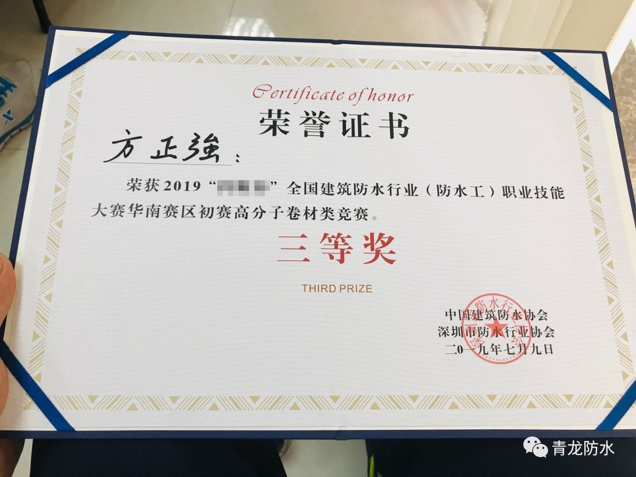 7月9日,由中國(guó)建筑防水協(xié)會(huì)、深圳市防水行業(yè)協(xié)會(huì)共同主辦的2019年全國(guó)建筑防水行業(yè)職業(yè)技能大賽(華南賽區(qū))初賽圓滿(mǎn)落幕,來(lái)自青龍公司工程部的方正強(qiáng)獲得全國(guó)建筑防水職業(yè)技能大賽三等獎(jiǎng)的好成績(jī)。
