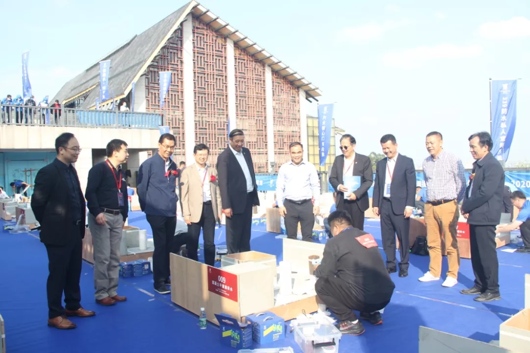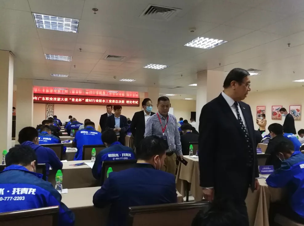 比賽過程中,廣東省建筑材料行業(yè)協(xié)會副秘書長、廣東省建材行業(yè)工會聯(lián)合會副主席王衛(wèi)國,中國建筑防水協(xié)會秘書長朱冬青,中國建筑防水協(xié)會副會長、深圳市防水行業(yè)協(xié)會會長瞿培華,廣東省建筑材料行業(yè)協(xié)會常務(wù)副會長陳環(huán),廣東省建筑防水材料協(xié)會會長張泳東,廣東省建筑材料行業(yè)協(xié)會創(chuàng)會會長、首席專家、高級工程師吳一岳,廣東青龍新材料有限公司董事長宋敦清、蘇州非礦院防水材料設(shè)計(jì)研究所所長沈春林教授等領(lǐng)導(dǎo)蒞臨比賽現(xiàn)場視察指導(dǎo)。朱秘書長希望青龍?jiān)诤霌P(yáng)工匠精神方面要為行業(yè)作表率,成為防水企業(yè)在防水補(bǔ)漏領(lǐng)域人才培育的標(biāo)桿。王副主席表示此次無論是理論考試還是模型實(shí)操,都非常的有水準(zhǔn),標(biāo)準(zhǔn)化程度較高,為以后的類似比賽進(jìn)行豎立了榜樣。