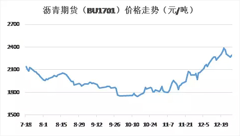 7月份之后,瀝青期貨價(jià)格一路下跌,至10月走穩(wěn)。11月上旬,受國(guó)際原油價(jià)格波動(dòng)影響,瀝青期貨價(jià)格開始穩(wěn)步上升,從1830元/噸上漲至12月中旬的2386元/噸,漲幅達(dá)到30%。