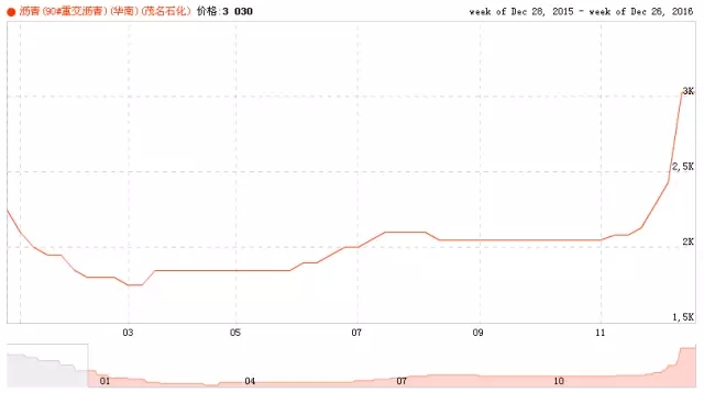 受原油價(jià)格變化影響,國(guó)內(nèi)瀝青價(jià)格從11月上旬開始進(jìn)入上升期。