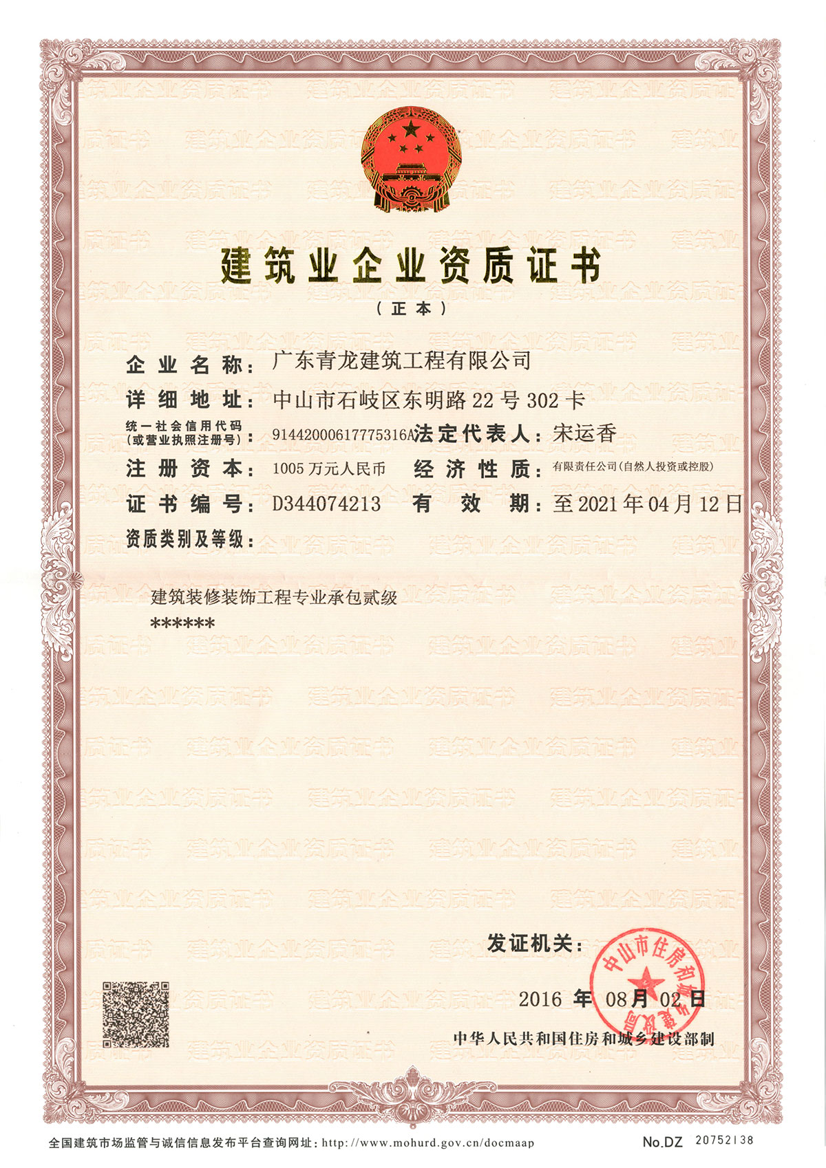 建筑裝修裝飾工程專業(yè)承包資質對企業(yè)資產、企業(yè)主要人員、企業(yè)工程業(yè)績都有著非常高的要求,建筑裝修裝飾工程專業(yè)承包貳級資質的成功取得,是對青龍實力的認可,對于進一步擴大企業(yè)的品牌影響力、提升企業(yè)競爭力有著重大意義。