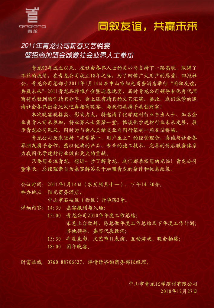 2011年青龍公司新春文藝晚宴暨招商加盟會誠邀社會業(yè)界人士參加