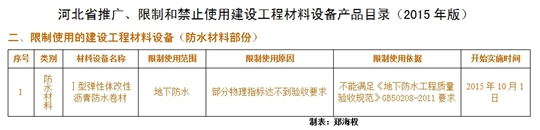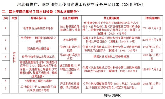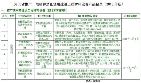 2015年版目錄是前七批“推廣、限制和淘汰使用產(chǎn)品目錄”的綜合更新版。其中,保留了仍需推廣、限制和禁止使用的建材裝備,結合近幾年河北省工程建設實際,又增補了新的內(nèi)容。本目錄共涉及182種產(chǎn)品,包括推廣類87種(新列入29種),限制類25 種(新列入12種),禁止類70種(新列入20種),新列入的各類產(chǎn)品,生效時間從2015年10月1日起實施。其中防水材料部份,推廣類6項(新列入2項),限制類1項(新列入1項),禁止類7項(新列入3項)。