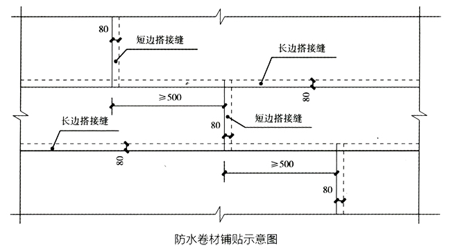 3、施工時,相鄰兩幅卷材短邊搭接縫應錯開,且不得小于500mm,上下兩層卷材長邊搭接縫應錯開,且不得小于幅寬的1/3。