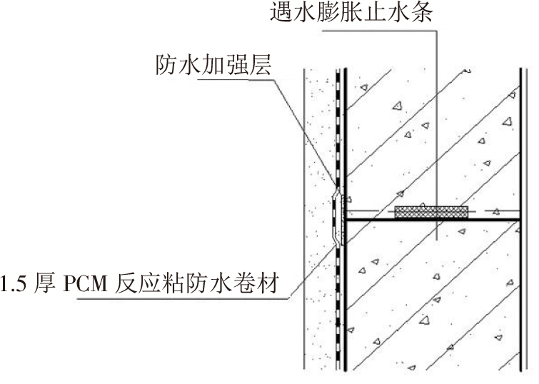 施工時應(yīng)將基面表層的浮砂、灰塵和雜物等清理干凈,比較干燥的基面需要先灑水濕潤,確保無積水;陰陽角需要用水泥砂漿施工成圓弧狀。再采用聚合物水泥漿作基層粘接劑,騎縫濕鋪一道1.5mm厚PCM反應(yīng)粘結(jié)型復(fù)合防水卷材作加強處理,施工縫兩邊附加層寬度應(yīng)大于250mm;然后使用同類防水層覆蓋鋪貼(圖8)。
