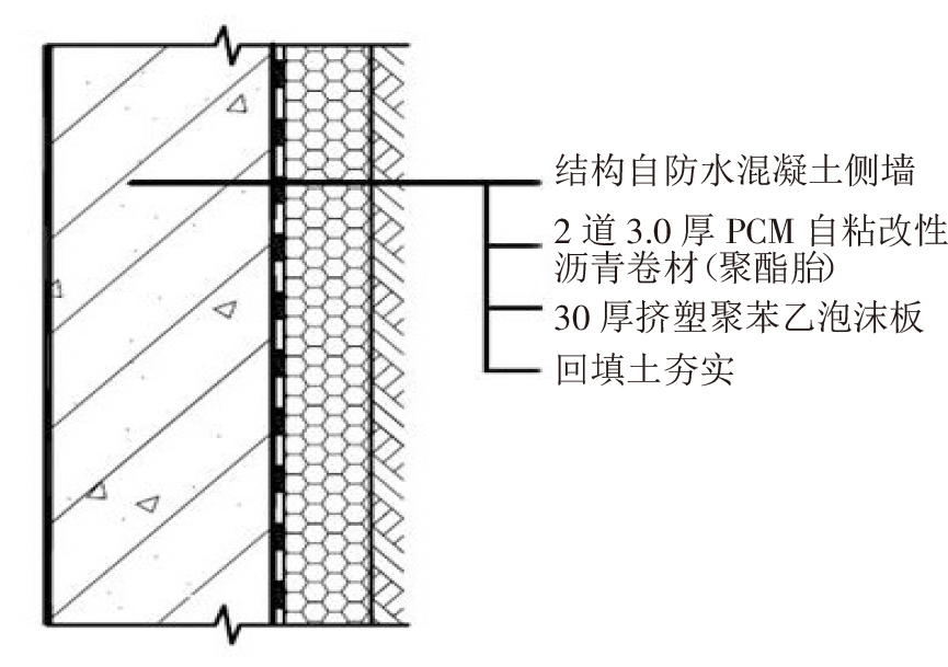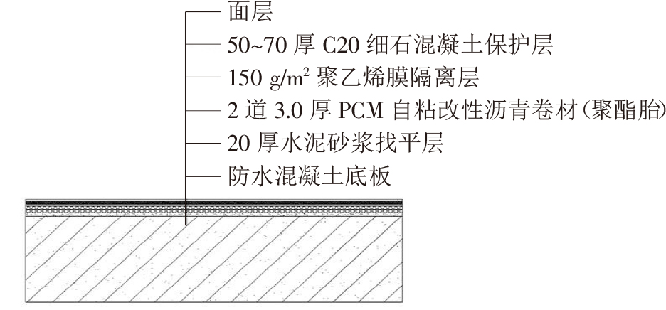 防水卷材選用本公司生產(chǎn)的3.0mm厚PCM自粘聚合物改性瀝青防水卷材(PY類)。該卷材是通過在樹脂和合成橡膠改性瀝青中加入少量活性成分,以聚酯胎作為胎體,以PE膜為表面材料,結(jié)合硅油隔離膜制備而成的防水卷材。該卷材具備較強的基層防竄水性能,卷材中的高分子材料可與基層粘接劑中的高分子和無機膠凝材料構(gòu)成界面互穿網(wǎng)絡(luò),能有效避免防水層出現(xiàn)整體失效的情況。材料可冷施工,無火災(zāi)隱患,不會污染環(huán)境,可直接在潮濕的基面上進行施工,基層無需做找平層,施工工藝便捷。另外,防水材料有較好的穩(wěn)定性、延伸性、耐腐蝕性和耐候性。