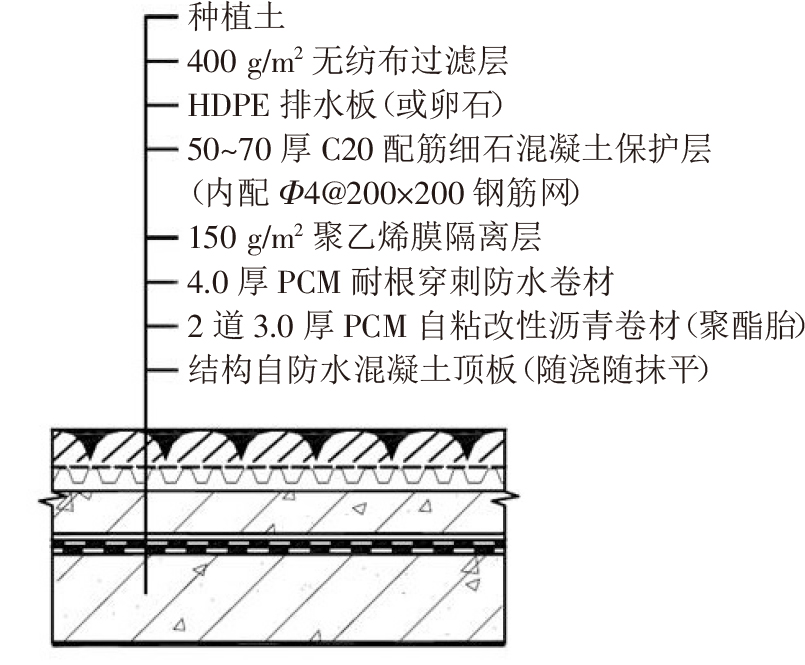 隔離層采用0.4mmPE膜,其主要作用為避免防水層與上方的細石混凝土保護層形成粘連,消除機械咬合力。過濾層采用單位面積質(zhì)量大于200g/m2的聚酯無紡布。種植土和植被層根據(jù)設(shè)計要求進行施工。