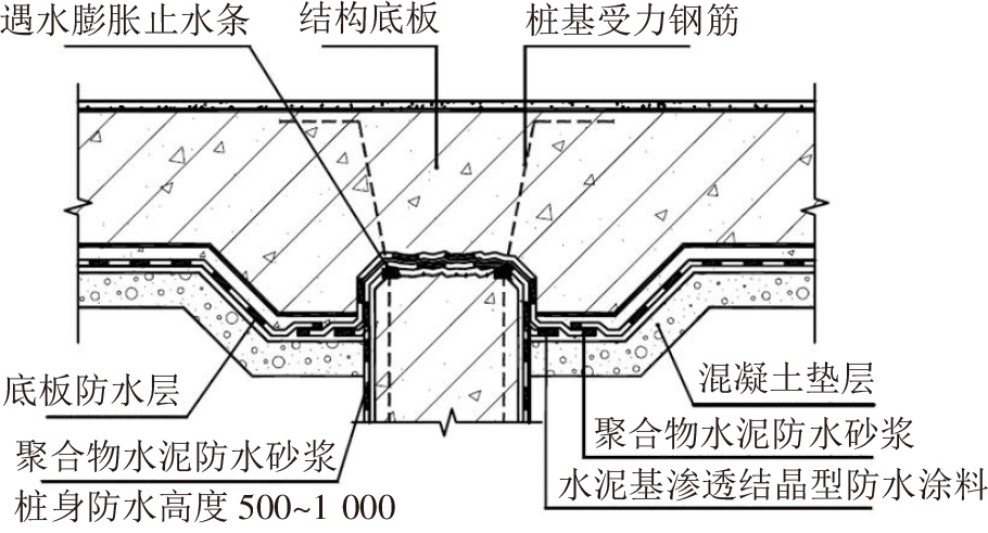施工時,先對基層進行清理,保證基面無灰塵、浮砂、雜物和明水;陰陽角用水泥砂漿抹成圓弧,然后對樁頭采用滲透結(jié)晶型防水涂料進行涂刷,用量為1.5kg/m2左右,并將樁頭上的砂眼和細小縫隙用防水涂料密實。同時,在樁頭四周300mm左右范圍內(nèi)涂刷聚合物水泥防水砂漿作為過渡層(圖9)。