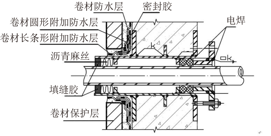 管道、線纜等存在更換需求,需用套管式防水設(shè)計,套管加焊止水環(huán)。套管與管道或線纜之間不得承受水壓,應(yīng)在節(jié)點的外部設(shè)置集水井。室內(nèi)套管的一端應(yīng)與外墻平齊,澆筑混凝土?xí)r端口預(yù)留的套管需密封,防止堵塞孔洞。室外套管突出外墻至少150mm,在外墻模板上定好預(yù)留穿墻管位置并開洞,外墻合模之前把套管放入模板洞中固定好,合模后再密封穿墻管與模板之間的間隙。管道與套管之間的間隙用柔性材料填充,保證端面光滑,同時管道的接口不得設(shè)置在套管內(nèi)。當(dāng)?shù)叵滤惠^高時,需在套管周圍設(shè)緊固裝置來確??p隙的填充料密實和不發(fā)生位移(圖7)