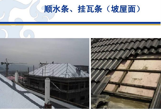 16、順水條:瓦下沿豎直方向設(shè)置的屋面構(gòu)件。處于掛瓦條下,防水層上。主要作用是架空掛瓦條。掛瓦條作用是將屋頂表面的瓦片固定在相應(yīng)位置。搭配使用合適的順水條可以使得屋頂?shù)呐潘Ч屯L(fēng)效果顯著增強,有利于保持夏季的涼爽和冬季的溫暖。